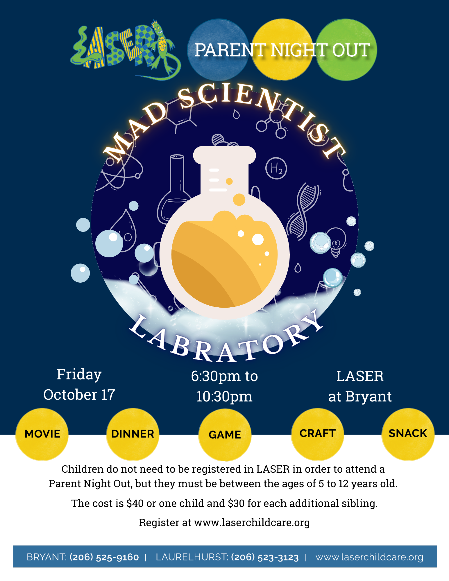 LASER is offering Parent Night Out on Friday, October 17th from 6:30 pm to 10:30 pm at LASER at Bryant. This month's theme is Mad Scientist Laboratory!