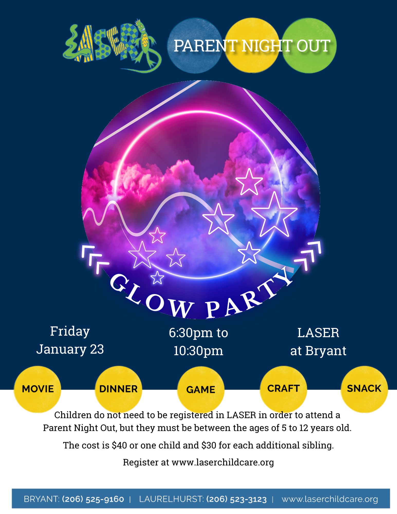 LASER is offering Parent Night Out on Friday, January 23 from 6:30 pm to 10:30 pm at LASER at Bryant. This month's theme is Glow Party!
